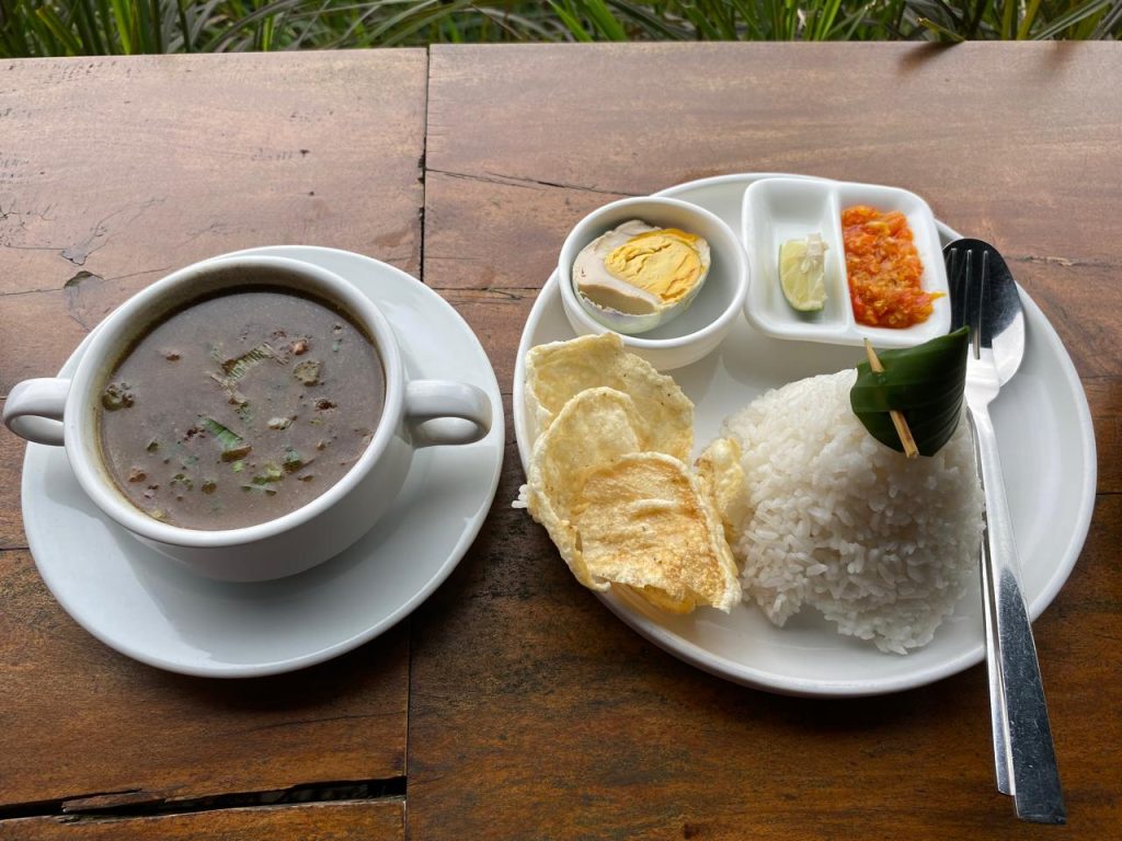 Kami memesan menu andalah Nasi Gunung Slamet, Rawon dan aneka minuman. Porsinya cukup besar dengan lauk aneka rupa. Ayam goreng, kerupuk tempe, telur, ikan goreng krispi, sate lilit dan tumisan daun pepaya. Nasi Gunung Slamet ada varian yang spesial dengan varian nasi goreng. Yang unik, nasi di menu ini dibentuk mirip gunung. Bayangkan deh, menikmati menu nikmat dan sedap ini di tengah hutan dengan hawa sejuk dan pemandangan indah. Alhamdulillah…