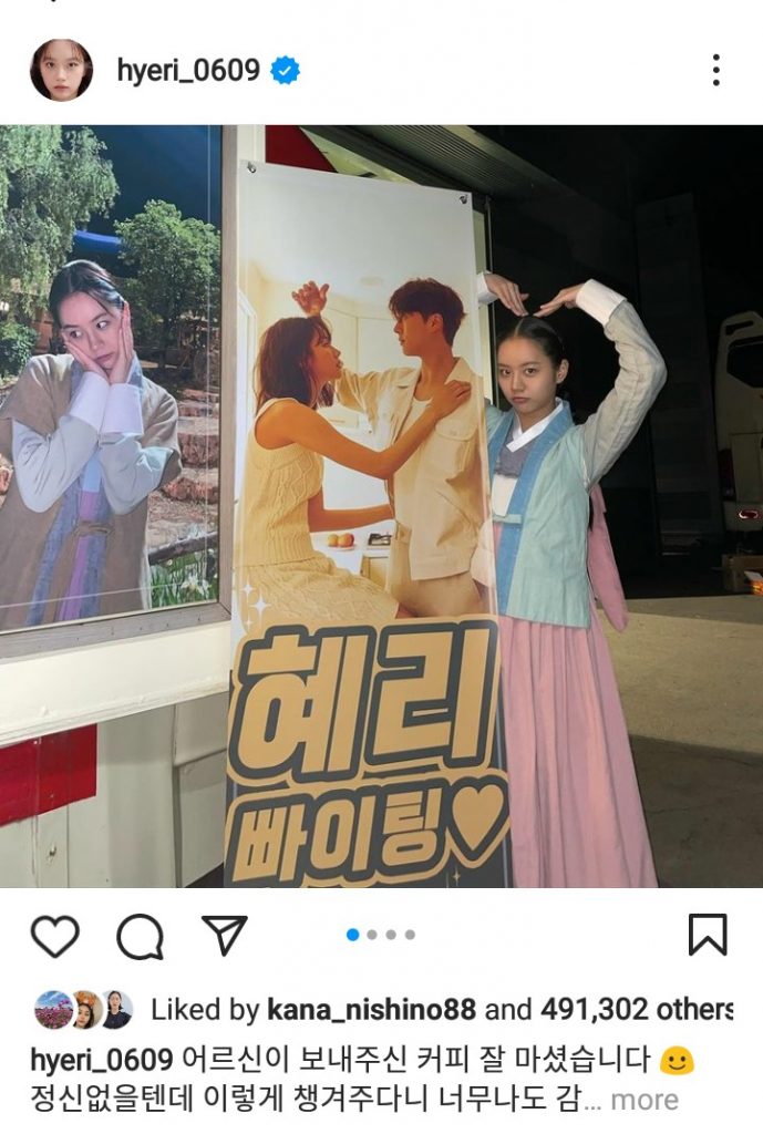 Dalam caption yang ditulis di Instagram, Hyeri merujuk karakter Jang Ki Yong seekor gumiho berusia 999 tahun. Dengan nada bercanda dia menulis, “Saya menikmati minum kopi yang dikirim orang tua itu. Hal-hal pasti gila untukmu sekarang, namun kamu masih merawatku seperti ini, aku sangat tersentuh. Seperti yang diharapkan dari Jang Ki Yong~~~~ kamu keren, kamu tampan, kamu yang terbaik. Saya akan mencoba melakukan pekerjaan yang baik untuk menyelesaikan syuting, yang sudah hampir selesai. Terima kasih banyak.”