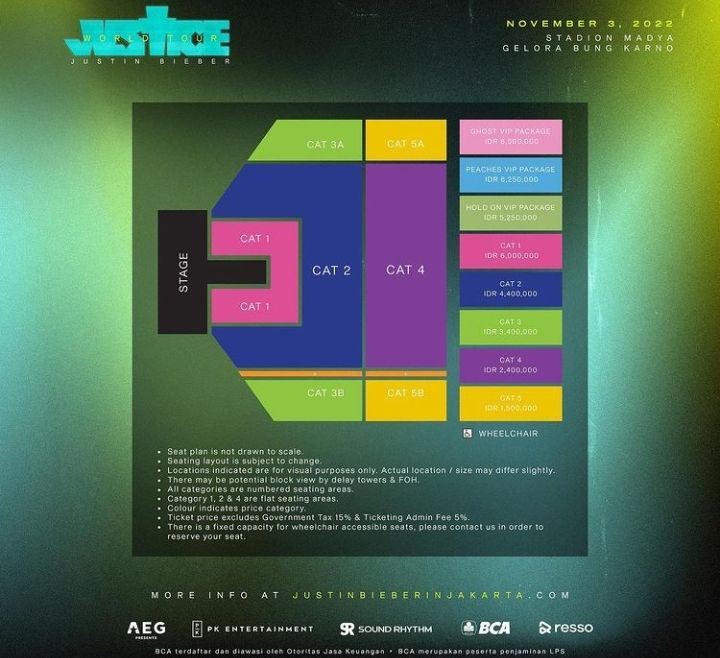 Penyelenggara konser Justice World Tour di Jakarta, AEG Present, PK Entertaiment dan Sound Rhythm mengumumkan kepastian waktu dan tempat konser melalui media sosial pada 24 Maret 2022. “Justin Bieber hari ini mengumumkan tanggal baru untuk Justice World Tour yang sangat ditunggu-tunggu, termasuk Jakarta pada 03 November 2022 di Stadion Madya, Gelora Bung Karno.”