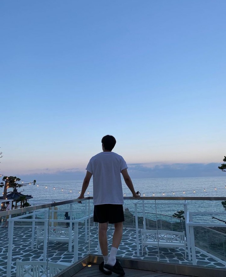 Foto-foto yang dirilis menunjukkan bintang drama ‘Hometown Cha Cha Cha‘ ini berdiri di teras sambil memandangi laut.