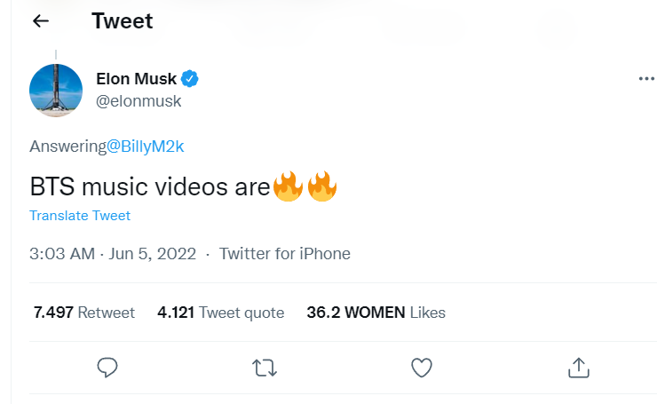 Namun, Elon Musk tiba-tiba memberikan jawaban yang mengejutkan. “Video musik BTS .. (dia membubuhkan dua emoticon api),” katanya, menunjukkan minatnya pada boygroup global.