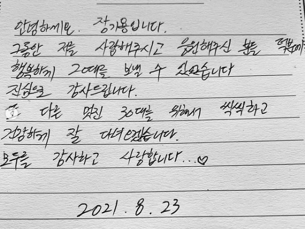 Menjelang pendaftarannya, Jang Ki Yong mengunggah surat dengan tulisan tangan pada Instagram bersama foto hitam putih dirinya dengan potongan rambut baru.
