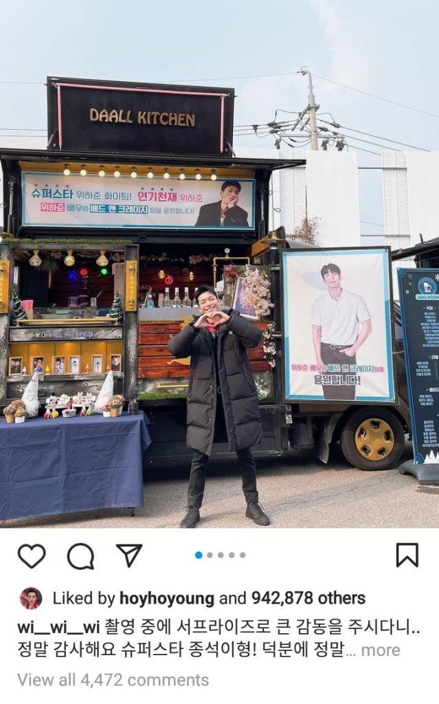 Dalam caption dibawa foto, Wi Ha Joon menulis, “Saya benar-benar tersentuh oleh kejutan ini selama pembuatan film… Terima kasih banyak, superstar Lee Jong Suk! Berkat kamu, kami bisa mendapatkan kekuatan untuk syuting. Aku memberikan hati ini untuk Lee Jong Suk.” Dalam bahasa Inggris, dia menambahkan, “Thank you so much, my bro.”