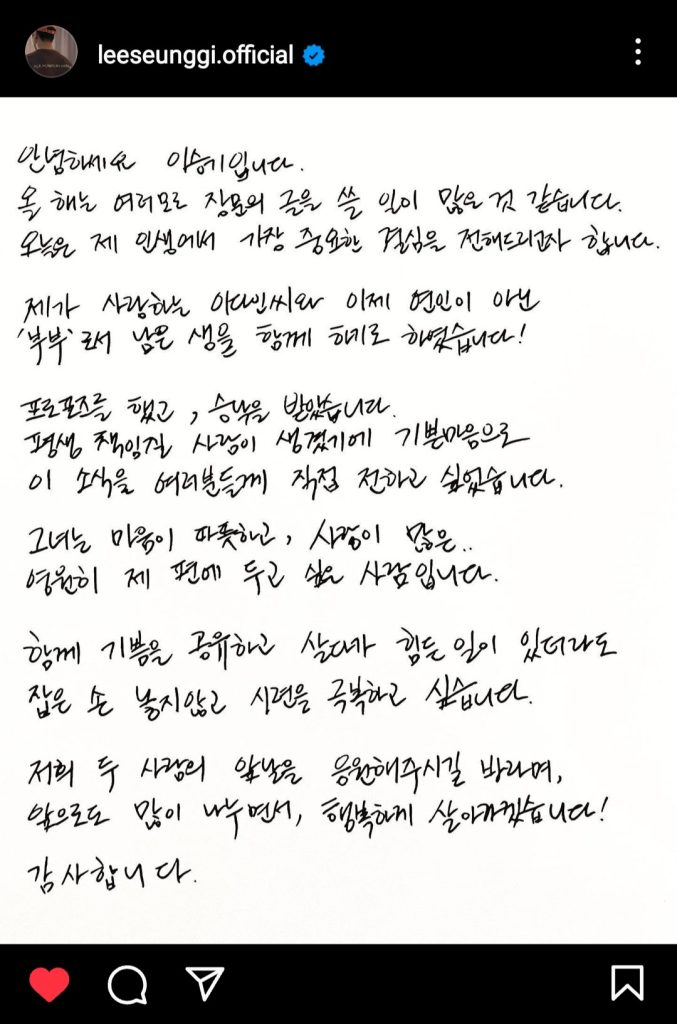 Pada 7 Februari, aktor dan penyanyi Lee Seung Gi mengumumkan rencana pernikahannya secara langsung melalui akun Instagramnya, dan mendapatkan perhatian besar.