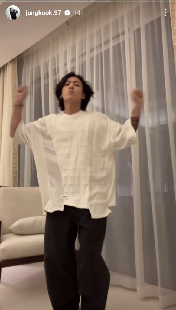Setelah itu, idol yang bernama lengkap Jeon Jung-kook tersebut menampilkan video sedang menari dengan iringan lagu BTS “Run BTS”. Mengenakan atasan broken white gombrang berlengan sesiku dengan celana gelap dan sepatu putih, ia menari dengan luwes sekaligus jenaka, bahkan tertawa geli di akhir video.